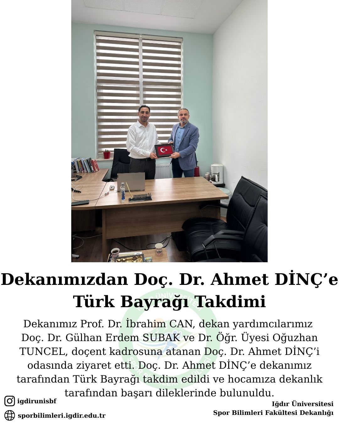 Dekanımız Prof. Dr. İbrahim CAN, dekan yardımcılarımız Doç. Dr. Gülhan Erdem SUBAK ve Dr. Öğr. Üyesi Oğuzhan TUNCEL, doçent kadrosuna atanan Doç. Dr. Ahmet DİNÇ’i odasında ziyaret etti. Doç. Dr. Ahmet DİNÇ’e dekanımız tarafından Türk Bayrağı takdim edildi ve hocamıza dekanlık tarafından başarı dileklerinde bulunuldu.