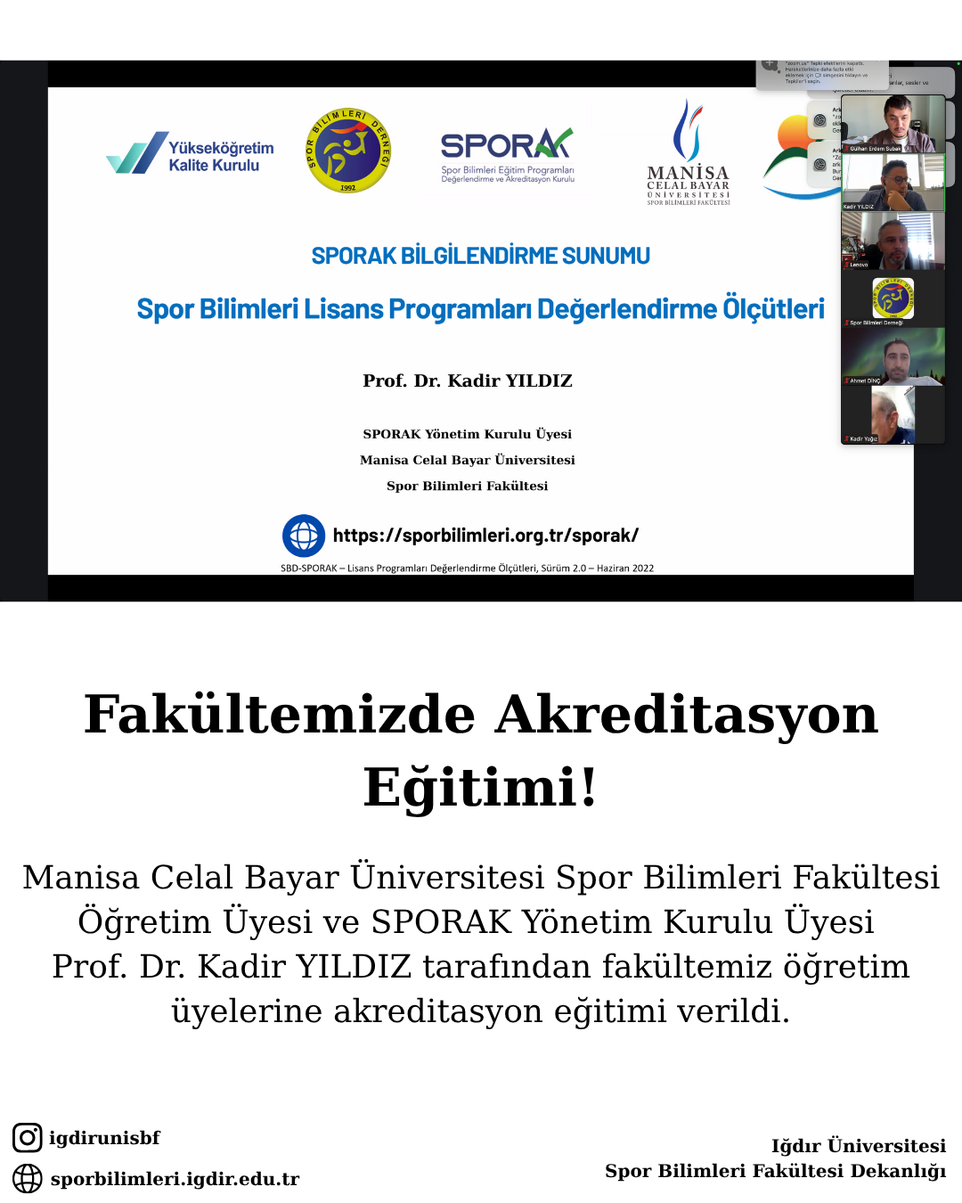 Manisa Celal Bayar ÜniversitesiSpor Bilimleri Fakültesi Öğretim Üyesi ve SPORAK Yönetim Kurulu Üyesi Prof. Dr. Kadir YILDIZ tarafından fakültemiz öğretim üyelerine akreditasyon eğitimi verildi.Prof. Dr. Kadir YILDIZ’a, fakültemize değerli katkılarından dolayı teşekkür ederizIğdır Üniversitesi Spoır Bilimleri Dekanlığı