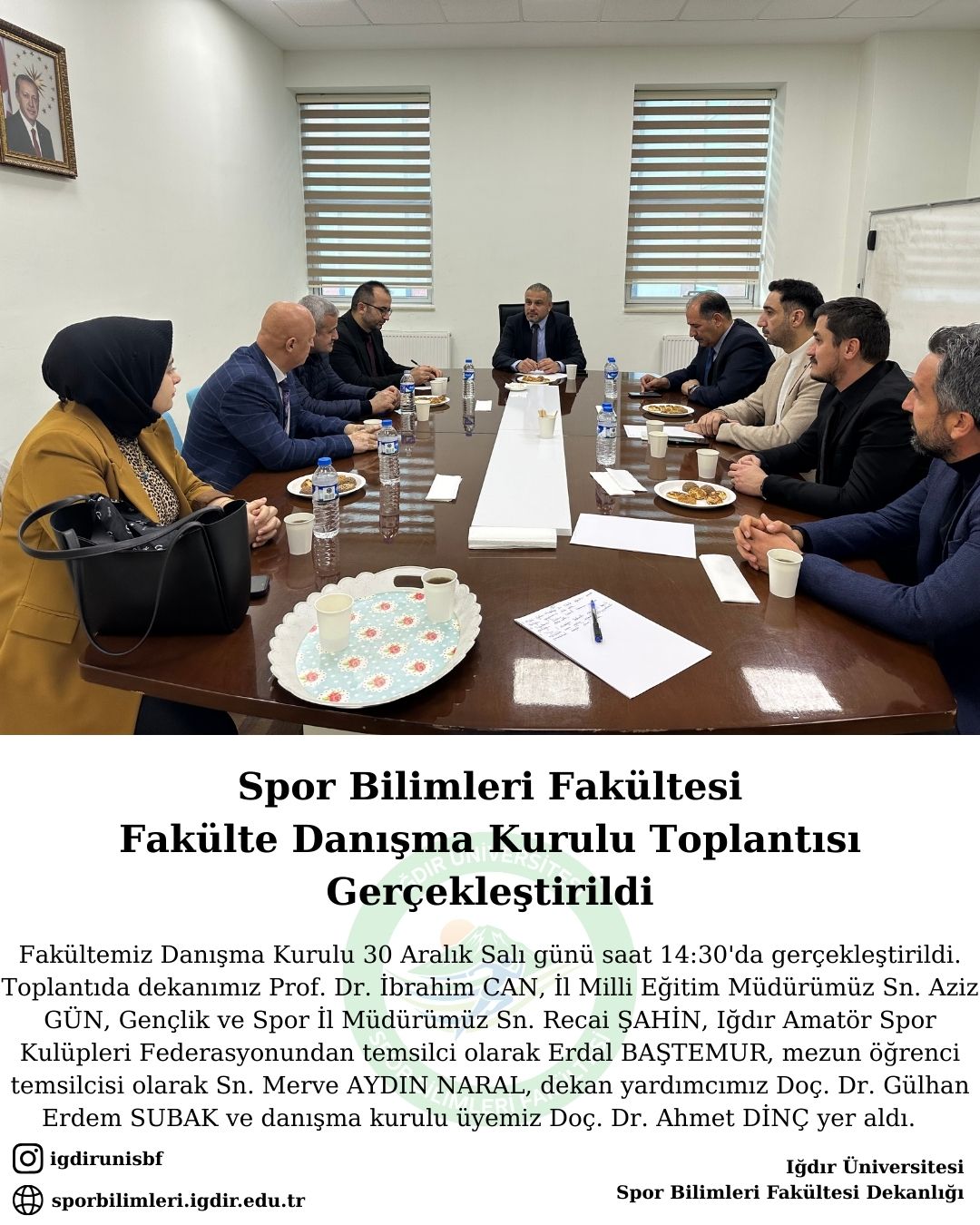 Şehir-Üniversite bağlantısını güçlendirmeyi hedefleyen ve Iğdır’a kendi alanında katkı yapmayı hedefleyen Iğdır Üniversitesi Spor Bilimleri Fakültesi, dış paydaşlarla iletişimini geliştiriyor. Bu kapsamda, Fakültemiz Danışma Kurulu 30 Aralık Salı günü saat 14:30'da gerçekleştirildi. Toplantıda dekanımız Prof. Dr. İbrahim CAN, İl Milli Eğitim Müdürümüz Sn. Aziz GÜN, Gençlik ve Spor İl Müdürümüz Sn. Recai ŞAHİN, Iğdır Amatör Spor Kulüpleri Federasyonundan temsilci olarak Erdal BAŞTEMUR, mezun öğrenci temsilcisi olarak Sn. Merve AYDIN NARAL, dekan yardımcımız Doç. Dr. Gülhan Erdem SUBAK ve danışma kurulu üyemiz Doç. Dr. Ahmet DİNÇ yer aldı.